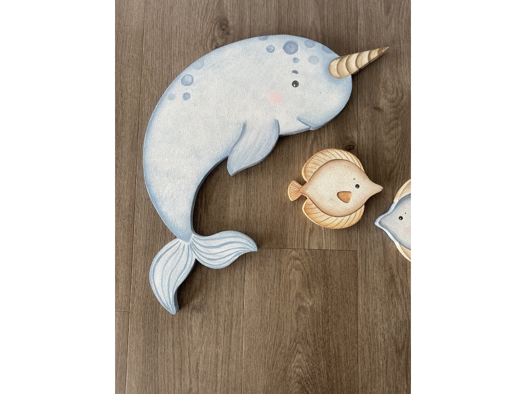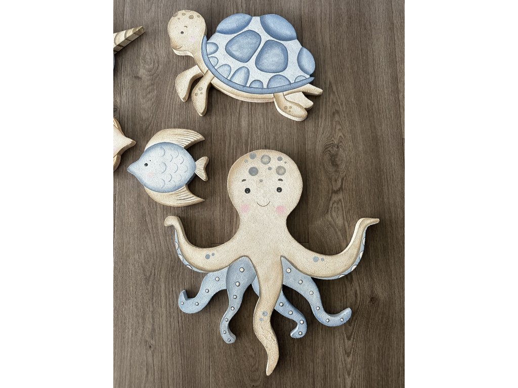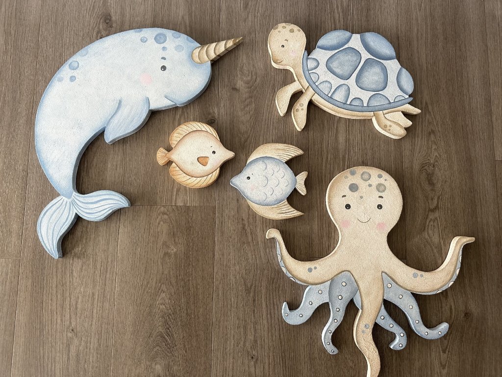 Každý kousek je ručně malovaný a společně tvoří harmonickou, hravou kompozici, která promění stěnu v kouzelný podvodní svět.