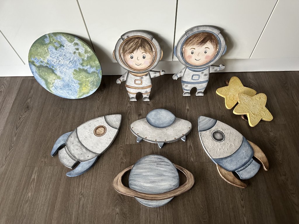 📏Velikosti: kosmonaut 40 cm, Země a planeta s prstencem 40 cm, UFO 35 cm, hvězda 20 cm, raketa 40 cm😊